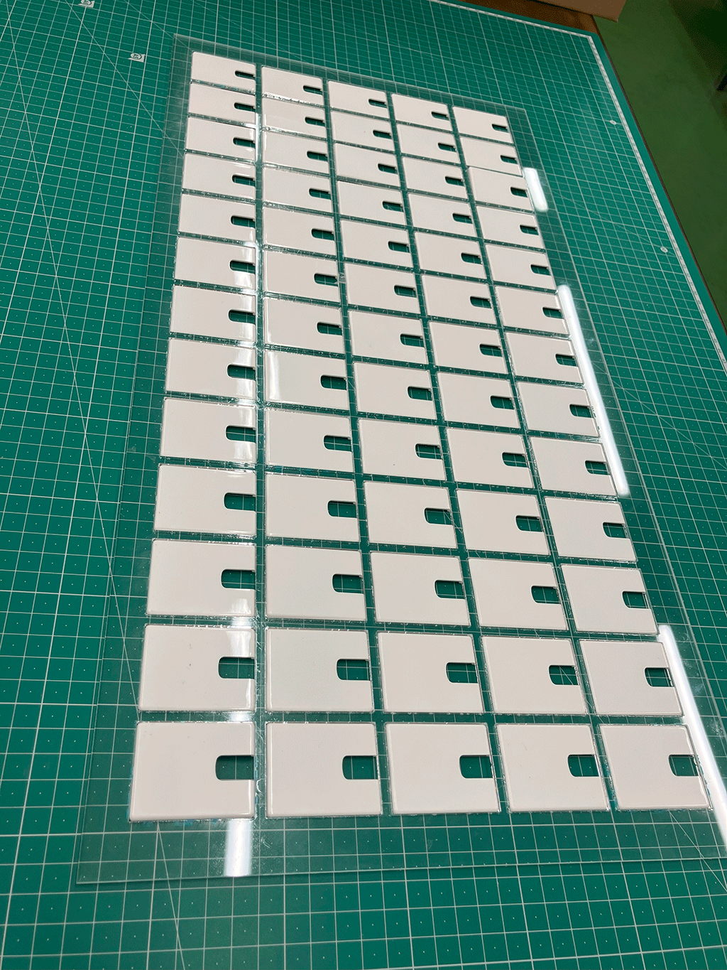 5個×13段で65個セットできる治具を、Epilog Laser Fusion Makerで3mmのアクリルをカットして制作しました。